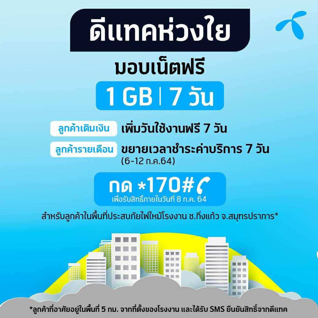 - สำหรับลูกค้าดีแทคเติมเงิน – ลูกค้าดีแทคเติมเงินที่อาศัยในพื้นที่รัศมี 5 กิโลเมตร ดีแทคขอมอบเน็ตฟรี 1GB พร้อมขยายวันใช้งานเพิ่มเป็นจำนวน 7 วัน ระหว่าง 6-12 กรกฎาคม 2564