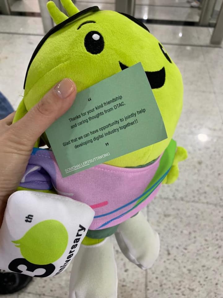 (อัพเดท) หลังจากนั้น สมชัยก็ส่งตุ๊กตา “น้องอุ่นใจ” ให้กับอเล็กซานดรา โดยมีตัวแทนของทั้ง AIS และ dtac มอบตุ๊กตาให้แก่กันและกัน ดังภาพ