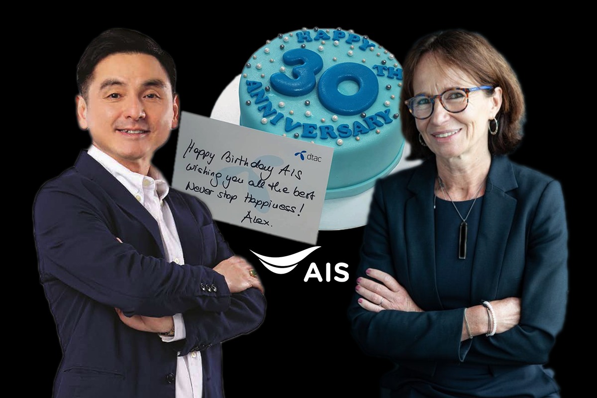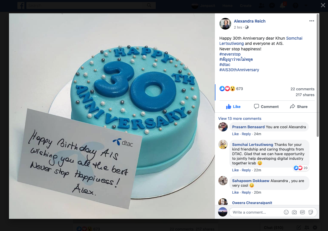 แต่วันนี้ ‘อเล็กซานดรา ไรช์’ CEO ของ dtac ก็ได้โพสต์ภาพลง Facebook ส่วนตัว พร้อมกับแท็กหา CEO ของ AIS อย่าง ‘สมชัย เลิศสุทธิวงค์’ โดยเมื่อแปลเป็นภาษาไทยจะได้ใจความว่า “ยินดีกับการครบรอบ 30 ปีด้วยค่ะ ถึงคุณสมชัย เลิศสุทธิวงค์ และทุกคนใน AIS ค่ะ เราจะไม่หยุดที่จะมีความสุขค่ะ!” พร้อมติด hashtag #neverstop, #สัญญาว่าจะไม่หยุด, #dtac และ #AIS30thAnniversary