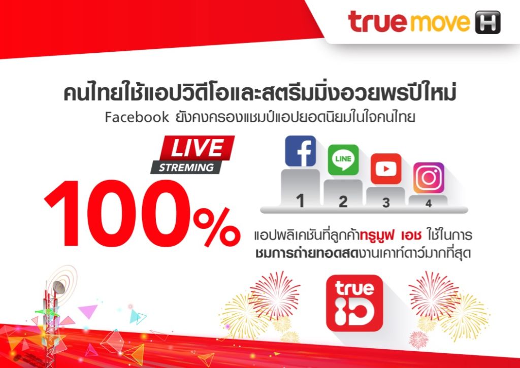 ทางด้านของ ทรูมูฟ เอช เครือข่าย 4G ยอดเยี่ยมในเอเชียแปซิฟิก ก็ได้เผยการใช้งานดาต้าเพื่ออวยพรและเฉลิมฉลองเทศกาลปีใหม่เช่นเดียวกัน โดยระหว่างวันที่ 31 ธันวาคม 2562 ถึง 1 มกราคม 2563 มีการอวยพรผ่านเครือข่ายทรูมูฟ เอช ในส่วนของแอปพลิเคชันที่เป็นวิดีโอและสตรีมมิ่ง มีการเติบโตสูงเกือบ 100% เมื่อเทียบกับการเติบโตของแอปอื่นๆ ซึ่งแอปพลิเคชันที่มีการใช้งานมากที่สุดในช่วงเวลาดังกล่าว ยังคงเป็น Facebook เช่นหลายปีที่ผ่านมา รองลงมาคือ LINE, Youtube, และ Instagram ตามลำดับ ส่วนแอปพลิเคชันที่ลูกค้า