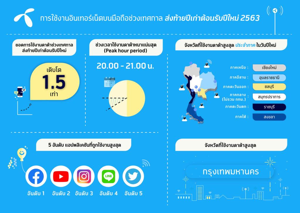 - สำหรับแอปพลิเคชันที่นิยมใช้งานสูงสุดในช่วงเทศกาลปีใหม่ คือ 1. Facebook 2. YouTube 3. Instagram 4. LINE และ 5. Twitter