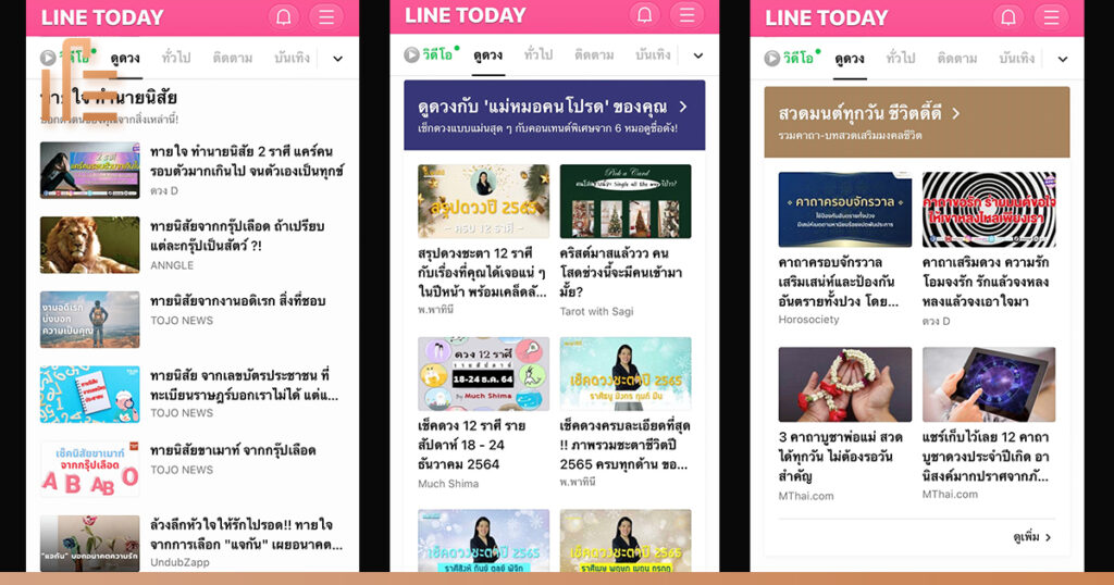 ในขณะที่จำนวนผู้ใช้งานโดยรวมของ LINE TODAY ก็เพิ่มขึ้นสูงถึงกว่า 247% ตามไปด้วย และกว่า 87% ของผู้เข้าชมแท็บนี้ มองเห็นและรับรู้โฆษณาของแบรนด์ นี่จึงถือเป็นพื้นที่ใหม่มาแรงสำหรับนักการตลาด ที่แบรนด์ใหญ่อย่าง DTAC นำมาประยุกต์ใช้เพื่อนำเสนอสื่อโฆษณาให้เข้าถึงลูกค้าในรูปแบบใหม่ๆ ได้อย่างมีประสิทธิภาพ ในขณะที่คอนเทนต์ยอดฮิตบนแท็บ ‘ดูดวง’ ไม่ว่าจะเป็นเรื่องเช็คดวงทั่วไป อย่าง เช็คดวง 12 ราศี หรือ 4 ราศีเตรียมตัวรวย หรือแบบอัพเดทใหม่เป็นประจำ อย่าง ดวงรายวัน ตลอดจนคอนเทนต์เพื่อการพัฒนาตนเอง (ทำชีวิตให้ดีขึ้น) เช่น จุดธูปกลางแจ้ง ขอขมาเจ้ากรรมนายเวร เป็นต้น ต่างก็เป็น “พื้นที่” เข้าถึงกลุ่มลูกค้าที่มีแนวโน้มจะใช้สินค้าและบริการของ DTAC อยู่แล้วเช่นกัน