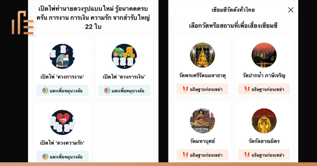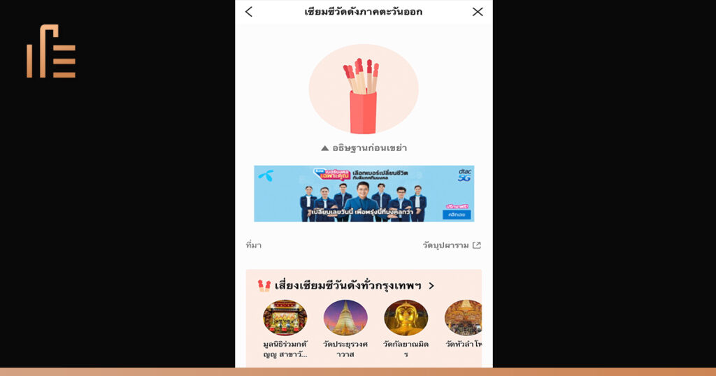 และเมื่อเจาะลึกลงไป จะพบว่า DTAC เลือกที่จะใช้พื้นที่สื่อที่เหมาะสม สอดรับกับแคมเปญใหญ่ของ แบรนด์ อย่าง “เบอร์มงคลเฉพาะคุณ” ได้เป็นอย่างดี โดยเลือกนำเสนอสื่อโฆษณาแคมเปญนี้ผ่านแท็บ ‘ดูดวง’ ใน LINE TODAY ที่นอกจากจะมีคอนเทนต์ด้านดวง โชคลาภต่างๆ แล้ว ยังมีกิจกรรม Interactive กับผู้อ่านมากมายที่แฝงอยู่ในแท็บดังกล่าว ทั้งกิจกรรมเซียมซีจากวัดดังภาคต่างๆ หมุนวงล้อเช็คดวง หรือแม้กระทั่งลูกเล่นไอคอน “กระบอกเซียมซี” ให้คลิกเพื่อเขย่า เป็นต้น