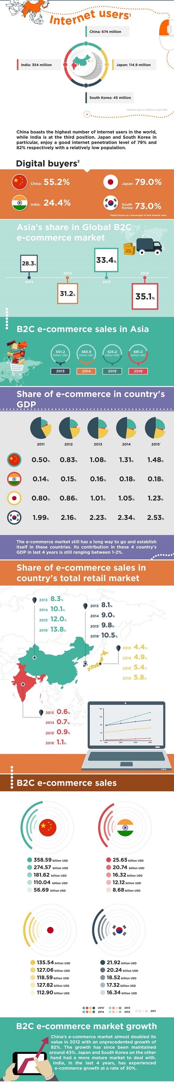 เอเชียเป็นตลาดอีคอมเมิร์ชใหญ่ที่โลกให้ความสนใจ อัตราการเติบโตและสถิติน่าที่งมากมายเกิดขึ้นในตลาดแห่งนี้ตลอดช่วงหลายปีที่ผ่านมา โดยเฉพาะใน 4 พื้นที่ตลาดหลักอย่างจีน-อินเดีย-ญี่ปุ่น-เกาหลีใต้ ซึ่ง INFOGRAPHIC ต่อไปนี้จะบรรยายฉายภาพการเติบโตให้ทุกคนได้เห็นอย่างชัดเจน