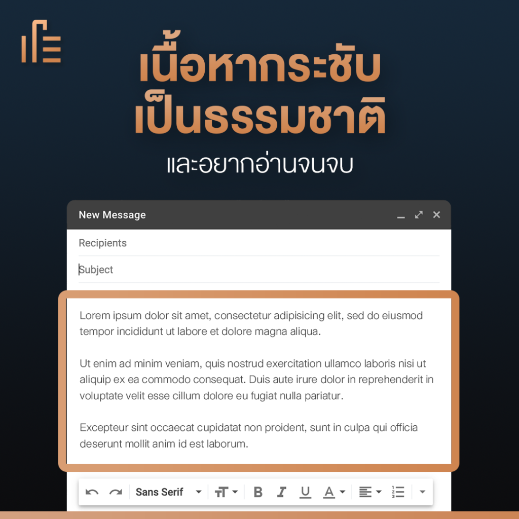 การสะกดคำในยุคนี้สำคัญมากเลยนะคะ ถ้าผู้รับพบเห็นความผิดพลาดของเนื้อหาที่เกิดจากการสะกดคำผิดบนอีเมลก็จะรู้สึกไม่น่าสนใจ หรือรู้สึกว่าผู้ส่งไม่ให้ความสำคัญกับการสะกดคำ และนั่นอาจเป็นสาเหตุสำคัญที่ทำให้ผู้อ่านเกิดทัศนคติด้านลบต่อแบรนด์ไปได้เลย ดังนั้น ควรระวังให้มาก อ่านทวนแต่ละประโยคให้บ่อย หรือเช็กตัวสะกดให้รอบคอบก่อนส่งออกทุกครั้ง