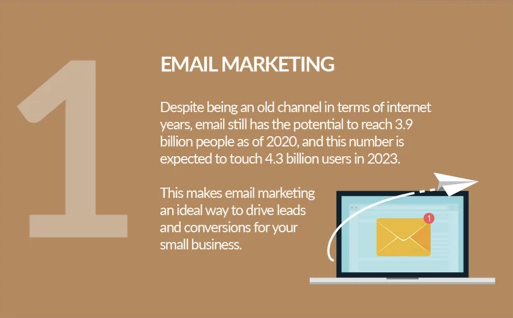 อีเมล์เป็นอีกหนึ่งช่องทางการส่งข้อความยอดนิยมบนโลกออนไลน์ เพราะเป็นช่องทางการสื่อสารในเชิงโฆษณาหรือเจรจาธุรกิจก็ได้ทั้งสิ้น อีเมล์ยังคงมีผู้ใช้งานสูงและเติบโตถึง 4.3 พันล้านรายในปี 2023