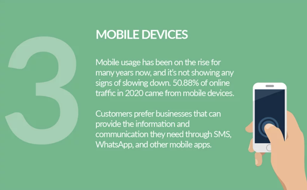 ด้วยจำนวนผู้ใช้งานสมาร์ทโฟนที่เพิ่มขึ้นทุกปี และมีการเข้าใช้งานออนไลน์ผ่านมือถือมากถึง 50.88% เมื่อปี 2020 ลูกค้าจะหาข้อมูลและสื่อสารผ่าน SMS Chat และโมบายแอปบนมือถือ