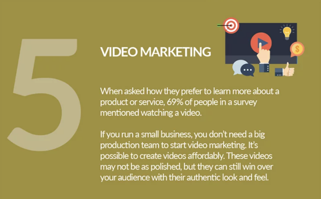 ดังนั้น ธุรกิจเอสเอ็มอี จึงควรทำวิดีโอแนะนำสินค้าและบริการสักชิ้นงาน อาจจะไม่ต้องใช้โปรดักชั่นทีมขนาดใหญ่มาก แต่อย่างน้อยมีสักชิ้นงานที่สร้างสรรค์ และเล่าเรื่องเกี่ยวกับสินค้าหรือบริการผ่านคลิปวิดีโอให้น่าสนใจและดึงดูดใจ ซึ่งผู้ชมจะรู้สึกจดจำในข้อมูลที่รอบด้านนั้น