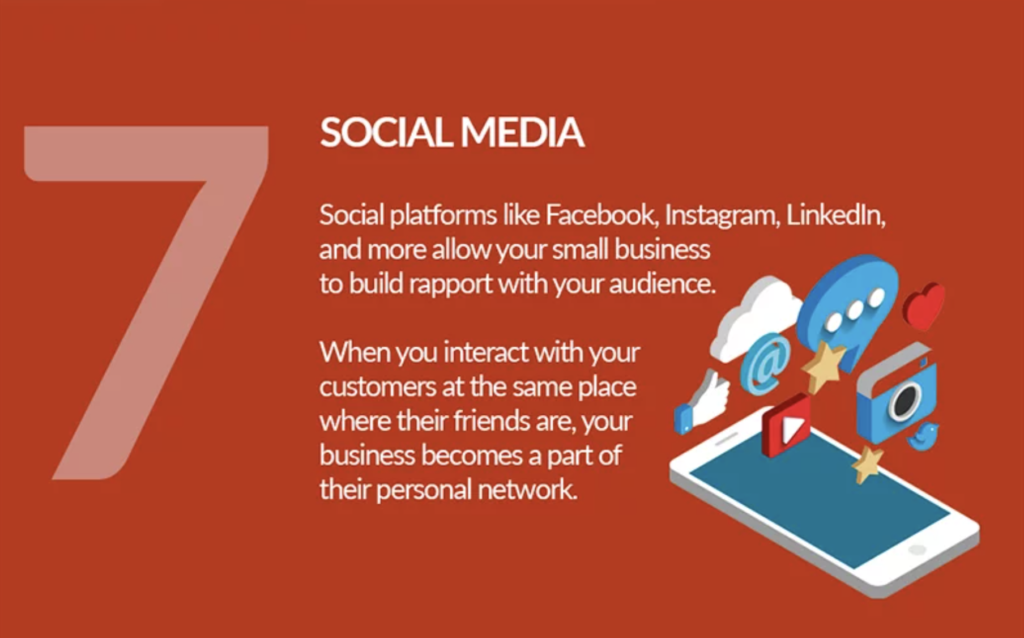 โซเชียลมีเดียแพลตฟอร์ม ไม่ว่าจะเป็น Facebook, Instagram, LinkedIn และอีกมากมายที่เอสเอ็มอี ควรจะสร้างโอกาสในการเข้าถึงลูกค้าให้ครบทุกช่องทาง เมื่อการมีปฏิสัมพันธ์กับลูกค้าในจุดต่าง ๆ บนช่องทางใหม่ ๆ จะทำให้ธุรกิจของคุณเป็นส่วนหนึ่งของเครือข่ายส่วนตัว การที่ลูกค้าได้เห็นแบรนด์ของคุณไม่ว่าจะเมื่อใดที่ช่องทางไหนก็ตาม จะทำให้พวกเขารู้สึกคุ้นเคยและเมื่อจำเป็นต้องใช้ก็จะเลือกแบรนด์ของคุณก่อน เช่น นึกถึงหมูกระทะ ก็จะนึกถึงบาบีก้อน หรือเมื่อนึกถึงน้ำอัดลม ก็จะเลือกโค้ก หรือเป๊ปซี่ก่อน เป็นต้น