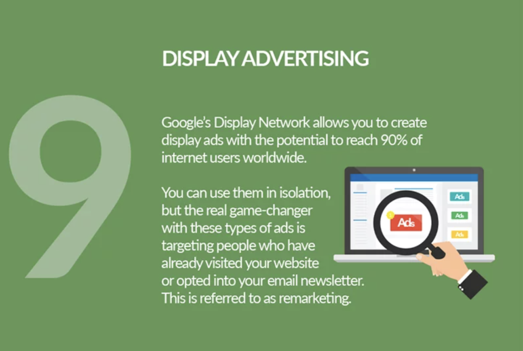 Google Display Network ยอมรับว่า การทำดิสเพลย์แอดจะเพิ่มโอกาสเข้าถึงคนทั่วโลกถึง 90% คุณสามารถใช้โฆษณาสร้างโอกาสที่ต่างไปจากเดิม