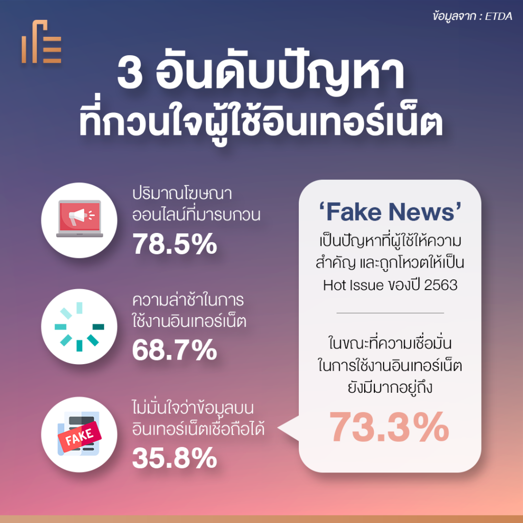 ส่วนปัญหากวนใจในการใช้อินเทอร์เน็ตมากสุดที่คือ โฆษณาออนไลน์รบกวนการใช้งาน 78.5% รองลงมาคือความล่าช้าในการเชื่อมต่อ 68.7% ปัญหาข้อมูลไม่น่าเชื่อถือ 35.8% แต่ผู้ตอบแบบสอบถาม 73.3% ยังคงเชื่อมั่นในความมั่นคงปลอดภัยในการใช้งานอินเทอร์เน็ต