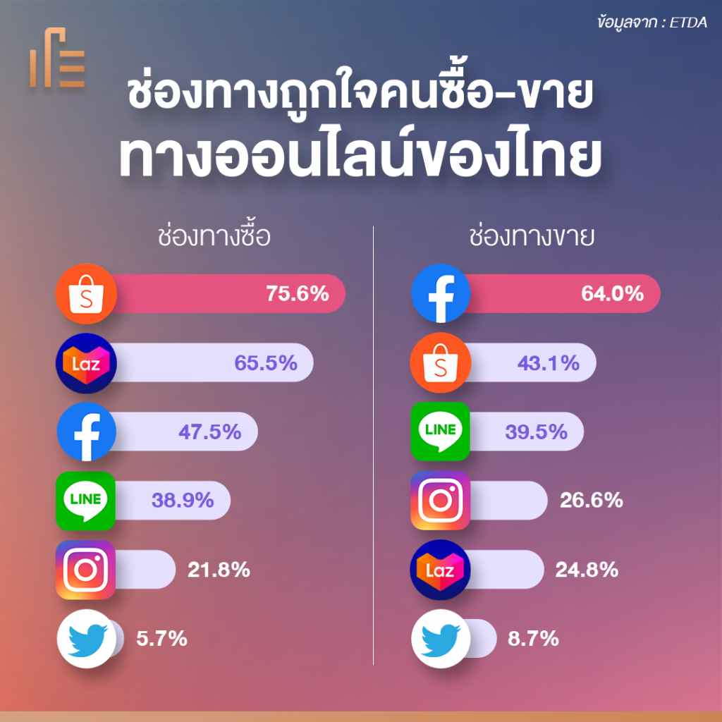ช่องทางที่ผู้ซื้อเลือกใช้เพื่อซื้อสินค้ามากที่สุด คือ e-Marketplace ได้แก่ Shopee 75.6% รองลงมาคือ Lazada 65.5% และ Social Media ได้แก่ Facebook Fanpage 47.5% และ Line 38.9% ต่างจากช่องทางที่ผู้ขายนิยมใช้ที่เพื่อขายของออนไลน์มากที่สุด คือ Facebook Fanpage 64.0% รองลงมาคือ Shopee 43.1% และ LINE 39.5% และยังพบว่า คนไทยนิยมใช้ LINE ติดต่อสื่อสาร 98.5% รองลงมาคือ Facebook Messenger, FaceTime และ WhatApp ตามลำดับ