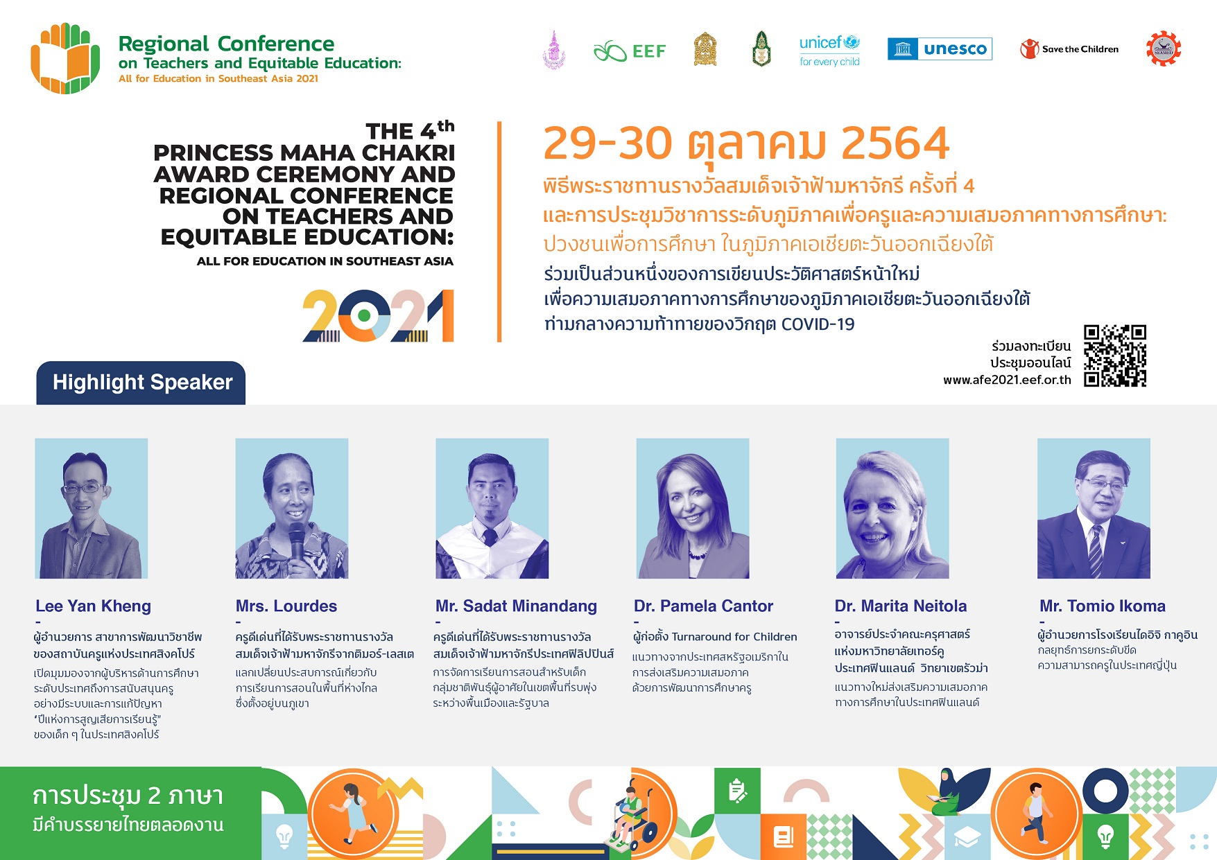 นอกจากนั้น ยังมีนักวิชาการและผู้ร่วมประชุมชื่อดังจากองค์กรชั้นนำทั่วโลกเข้าร่วมอภิปรายในหัวข้อต่างๆ อีกมากมาย ผู้ที่สนใจร่วมเป็นส่วนหนึ่งของการเขียนประวัติศาสตร์หน้าใหม่ของการศึกษาโลก ท่ามกลางความท้าทายของวิกฤตโควิด-19 ในพิธีพระราชทานรางวัลสมเด็จเจ้าฟ้ามหาจักรี ครั้งที่ 4 ปี 2564 และเวทีวิชาการระดับภูมิภาค “การประชุมวิชาการระดับภูมิภาคเพื่อความเสมอภาคทางการศึกษาและครู: ปวงชนเพื่อการศึกษาในภูมิภาคเอเชียตะวันออกเฉียงใต้” วันศุกร์ที่ 29 ตุลาคม 2564 เวลา 08.30 – 16.30 น. และวันเสาร์ที่ 30 ตุลาคม 2564 เวลา 9.00 – 16.30 น. สามารถลงทะเบียนผ่านเว็บไซต์ www.afe.eef.or.th