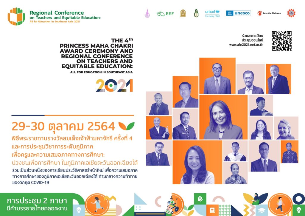 กองทุนเพื่อความเสมอภาคทางการศึกษา หรือ กสศ.องค์การยูเนสโก และองค์การยูนิเซฟ ประเทศไทย ผนึกกำลังภาคีเพื่อการศึกษา กระทรวงศึกษาธิการ มูลนิธิสมเด็จเจ้าฟ้ามหาจักรี องค์การรัฐมนตรีศึกษาแห่งเอเชียตะวันออกเฉียงใต้ (SEAMEO)และSave the Childrenเปิดเวทีระดมมุมมองและความคิดเห็นในระดับภูมิภาคในงาน “การประชุมวิชาการระดับภูมิภาคเพื่อครูและความเสมอภาคทางการศึกษา: ปวงชนเพื่อการศึกษา ในภูมิภาคเอเชียตะวันออกเฉียงใต้”ที่จะจัดขึ้นในวันศุกร์ที่29 ตุลาคม 2564 เวลา 8.30 – 16.30 น. และวันเสาร์ที่ 30 ตุลาคม 2564 เวลา 9.00 – 16.30 น.ผ่านช่องทางออนไลน์