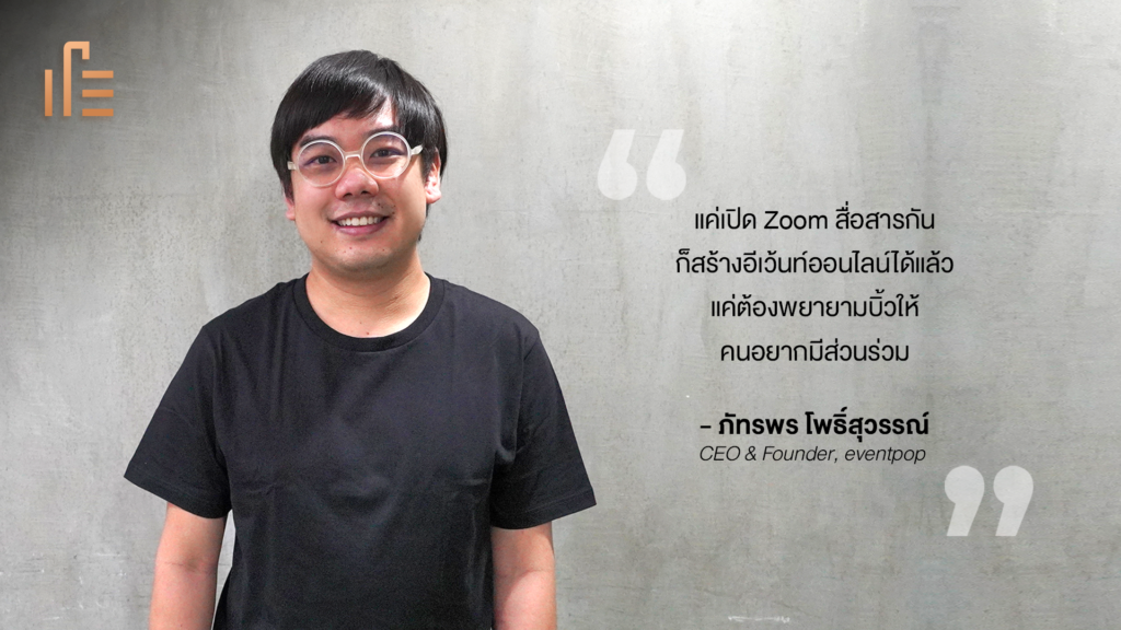 ตอนนี้อีกสิ่งหนึ่งที่ eventpop กำลังจะเริ่มทดลองทำ คือสิ่งที่เรียกว่า online experience เพื่อแก้ปัญหาจากโจทย์ที่เราเคยเจอก่อนหน้านี้ว่า “พอเป็นออนไลน์แล้วอาจจะไม่เหมือนกับประสบการณ์ที่เคยเจอกัน”