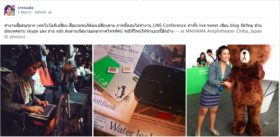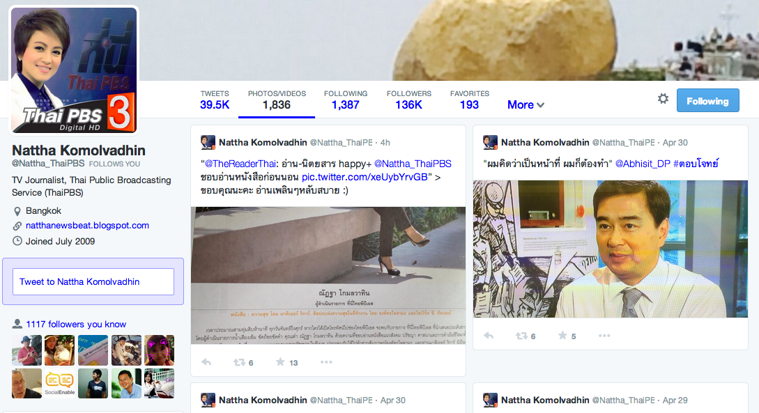 คุณณัฏฐา: สำหรับดิฉันช่วงแรกเน้ นการรายงานข่าว ความเคลื่อนไหวของประเด็นข่าวต่ างๆ และ Retweet ผ่านทาง Twitter ทุกวันนี้ยังใช้อยู่ แต่อาจจะเป็นเพราะช่วงหลังมีผู้ สื่อข่าวหลายสำนักมากขึ้น ทำให้บทบาทของเราในฐานะผู้ทวิ ตลดลง เน้น Retweet มากขึ้น และหาข้อมูลจาก Breaking News ของสำนักข่าวต่างประเทศมากขึ้น การรายงานช่วงหลังใช้ facebook มากขึ้น ในแง่ที่ว่าเขียนรายละเอียดได้ มากขึ้น และเป็นพื้นที่พูดคุย สนทนาในประเด็นข่าวได้มากขึ้นด้ วย สำหรับบทความยาวๆ ยังเขียน Blog อยู่ ก่อนจะแบ่งปันผ่านทวิตเตอร์ และ Facebook // YouTube ยังใช้อย่างสม่ำเสมอเพื่ออัพโหลดรายงาน การสัมภาษณ์ต่างๆ Instagram และ Google+ มีไว้เพื่อแชร์รูป และเนื้อหาข่าวต่างๆ