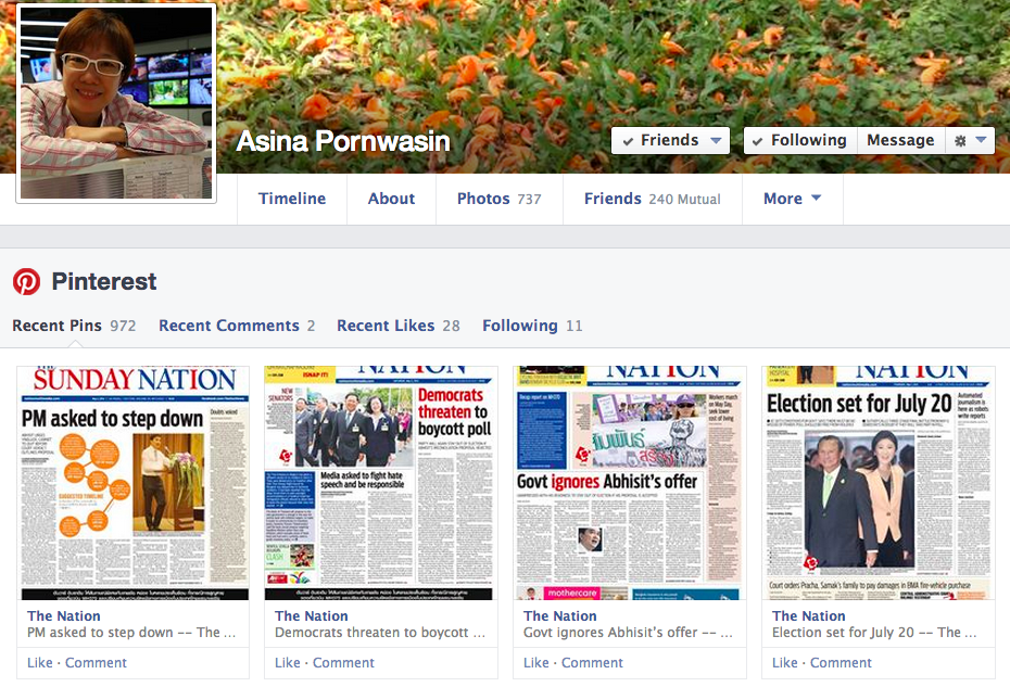 คุณอศินา: ปัจจุบันใช้ Twitter, Facebook, Instagram, Pinterest, LinkedIn, Google+, Slideshare, Storify, YouTube เพื่องานข่าว โดยมีการใช้ร่วมกันและใช้ ผสมาผสานกัน