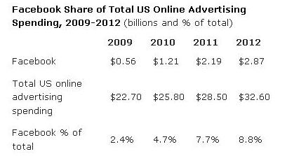ด้านล่างนี้คือตารางจาก AdAge แสดงให้เห็นถึงตัวเลขประมาณการณ์สำหรับรายได้จากโฆษณาของ Facebook ในอเมริกา เปรียบเทียบกับการจ่ายซื้อโฆษณาออนไลน์ในสหรัฐฯ ทั้งหมด