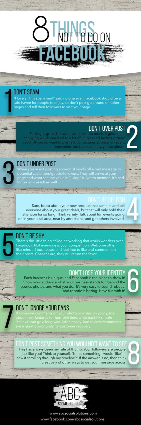8 สิ่งควรเลี่ยงนี้เป็นข้อมูลจากการรวบรวมของ ABC Social Solutions ซึ่งสร้างขึ้นเพื่อแสดงให้เห็นถึงข้อผิดพลาดที่ยิ่งใหญ่บนสังคม Facebook หนึ่งในนั้นคือการล่อลวง