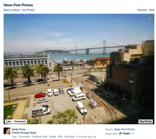 จากการทดสอบของสำนักข่าวต่างประเทศ พบว่าการโพสต์ภาพจากแว่น Google Glass สู่ Facebook นั้นแตกต่างจากการโพสต์ภาพจากอุปกรณ์พกพาทั่วไป โดยภาพที่โพสต์จะแสดงเป็นไอคอนสี่เหลี่ยมจัตุรัสขนาดเล็กบน profile ซึ่งจะชมเต็มจอได้หากคลิกเลือกที่ภาพ
