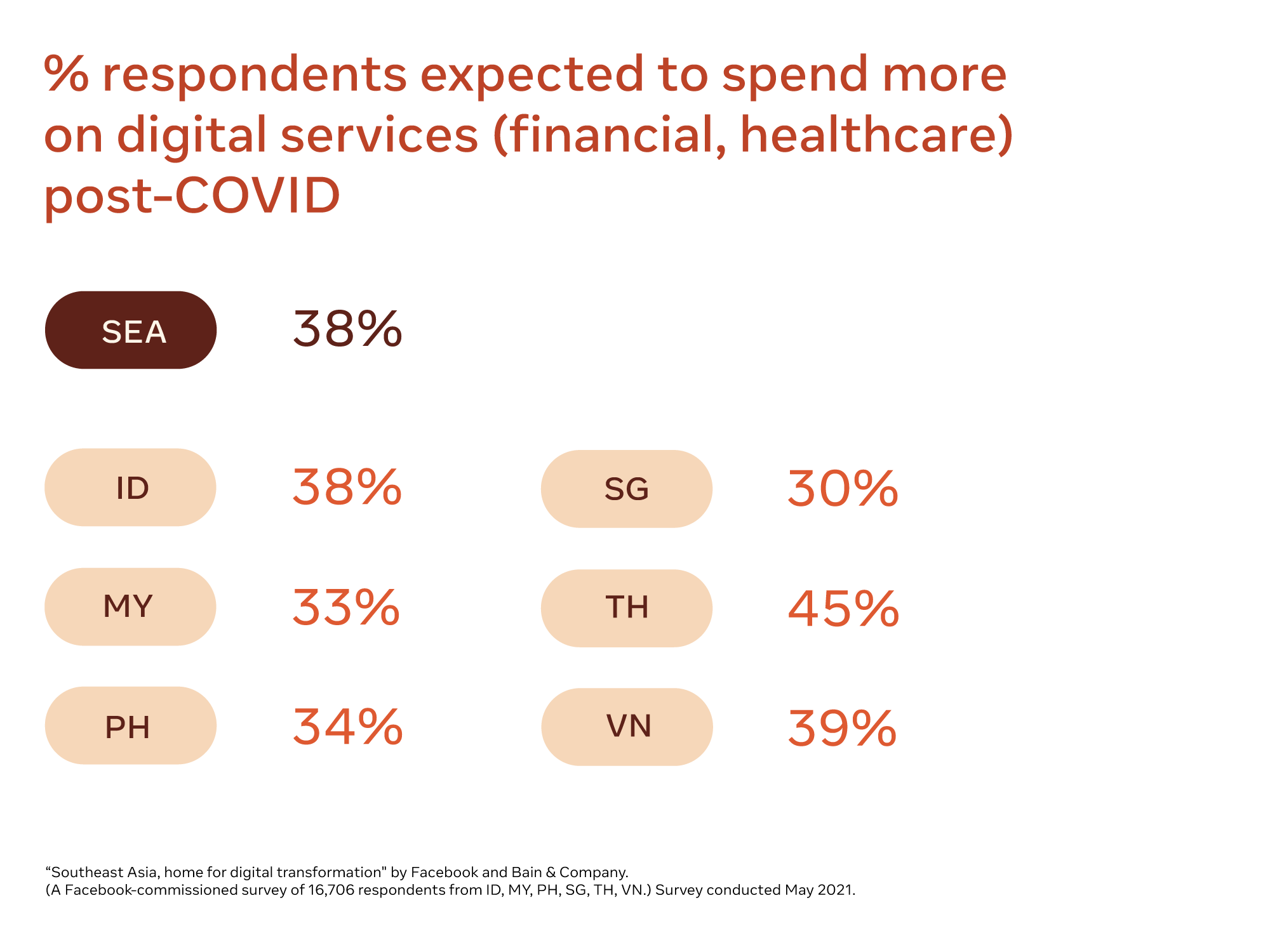 ผลการศึกษาครั้งใหม่ภายใต้หัวข้อ “Southeast Asia, the home for digital transformation” เป็นการต่อยอดจากผลการศึกษาในปีก่อนหน้านี้ ที่จัดทำขึ้นอย่างต่อเนื่องมาตั้งแต่ปี พ.ศ. 2561โดย Facebook และเบน แอนด์ คอมพานี และชี้ให้เห็นว่าภูมิภาคเอเชียตะวันออกเฉียงใต้จะมีผู้บริโภคดิจิทัลราว 350 ล้านคน และร้อยละ 73 ของผู้บริโภคในประเทศไทยจะกลายเป็นผู้บริโภคดิจิทัลภายในสิ้นปี พ.ศ. 2564 นอกจากนี้ อัตราการใช้จ่ายผ่านช่องทางดิจิทัลต่อคนได้เติบโตขึ้นร้อยละ 60 เมื่อเทียบกับปีที่ผ่านมา และยอดขายอี-คอมเมิร์ซโดยรวมจะเพิ่มขึ้นเป็นสองเท่าภายในปี พ.ศ. 2569