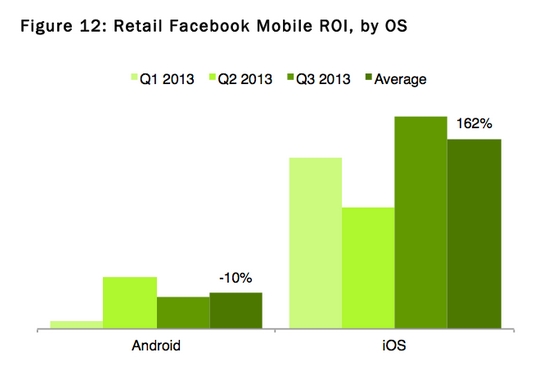 Nanigans หนึ่งในผู้ซื้อโฆษณารายใหญ่ของ Facebook ได้ศึกษาเกี่ยวกับการทำโฆษณาบน Facebook จำนวนกว่า 2 แสนล้านชิ้นพบว่า โฆษณาที่แสดงผลผ่านอุปกรณ์ระบบปฏิบัติการ iOS จะมีประสิทธิภาพมากกว่าโฆษณาที่แสดงอยู่บนอุปกรณ์ระบบปฏิบัติการ Android ถึง 1,790% ในระยะเวลารวม 3 ไตรมาสแรกของปีนี้ (2013) พบว่าโฆษณาที่แสดงผลบน iOS มีค่า RPC (Revenue Per Click) ที่สูงกว่าบน Android ราว 6.1 เท่าตัว โดย iOS มีค่าเฉลี่ย 0.94 เหรียญสหรัฐต่อการคลิกหนึ่งครั้งในขณะที่บน Android มีค่าเฉลี่ยเพียง 0.15 เหรียญสหรัฐเท่านั้น