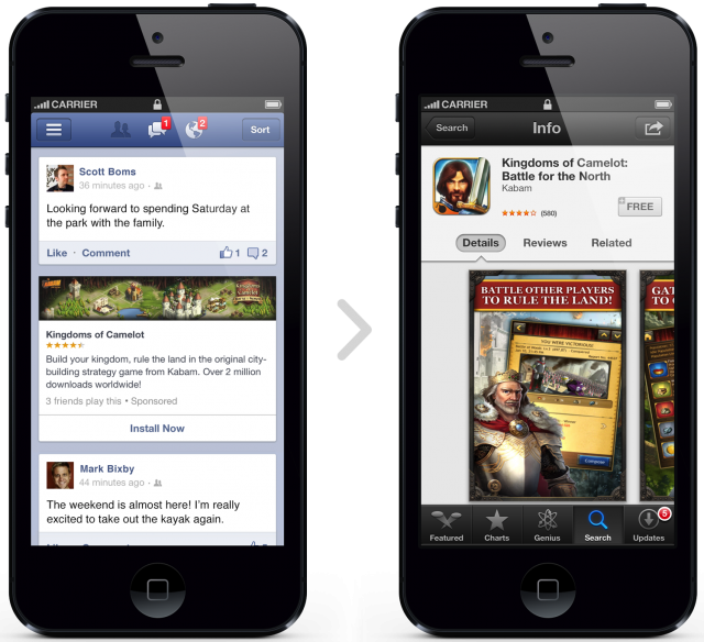 Mobile App Install Ads นี้เองที่ทำให้ชาว Facebook ที่เล่นบนโทรศัพท์มือถือพากันสงสัยว่าไปกด Like เข้าตอนไหน เมื่อเห็นข้อความใน news feed แนะนำเกมหรือแอพใหม่ แต่แท้จริงแล้วเป็นเพราะ Facebook เห็นรายได้จากการโฆษณาแอพพลิเคชั่นของนักพัฒนาทั่วโลก จึงต้องการกินรวบไว้เสียคนเดียว ด้วยการเปิดบริการโฆษณาแอพใหม่ในชื่อ Mobile App Install Ads โดยไม่เพียงจะปรากฎเป็นส่วนหนึ่งบน news feed ของผู้ใช้ Facebook บนโทรศัพท์มือถือ แต่โฆษณาตัวนี้จะพาผู้ใช้ไปยัง App Store หรือ Google Play ทันทีที่ผู้ใช้แตะมัน เพื่อที่จะได้โหลดแอพได้อย่างง่ายดาย