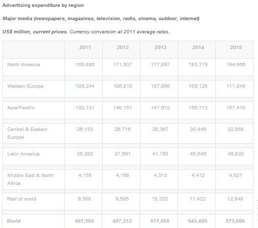 การสำรวจของบริษัทวิจัย ZenithOptimedia พบว่าตลาดโฆษณาทั่วโลกมีแนวโน้มเติบโตเฉลี่ย 4.1% ในปีหน้า (2013) และคาดว่าจะเติบโตอีก 5.6% ในปี 2015 โดยเอเชียจะเป็นหนึ่งในกลุ่มประเทศที่มีอัตราการเติบโตเกิน 9%