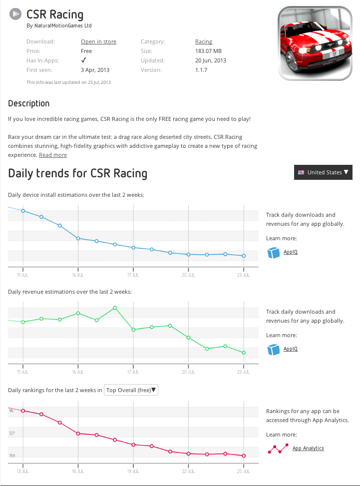 App Trends จะแสดงสถิติการดาวน์โหลด, รายได้ที่ได้รับ และอันดับของแอพ โดยข้อมูลทั้งหมดจะแสดงย้อนหลังเป็นเวลา 2 สัปดาห์ ซึ่งข้อดีอีกอย่างคือ App Trends สามารถแสดงข้อมูลของแอพทุกๆ ตัวบน Google Play และ App Store ได้