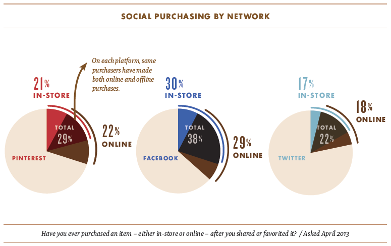 จากรูปด้านบนจะเห็นว่า Facebook เป็นช่องทางที่ผลักดันให้เกิดการซื้อสินค้าจริงได้มากที่สุด (สำหรับประเทศสหรัฐอเมริกา) โดยเกือบ 1 ใน 3 ของผู้ใช้ Facebook ได้ซื้อสินค้าจริงๆ หลังจากที่ได้ Share หรือ Comment เกี่ยวกับสินค้านั้นๆ ไว้