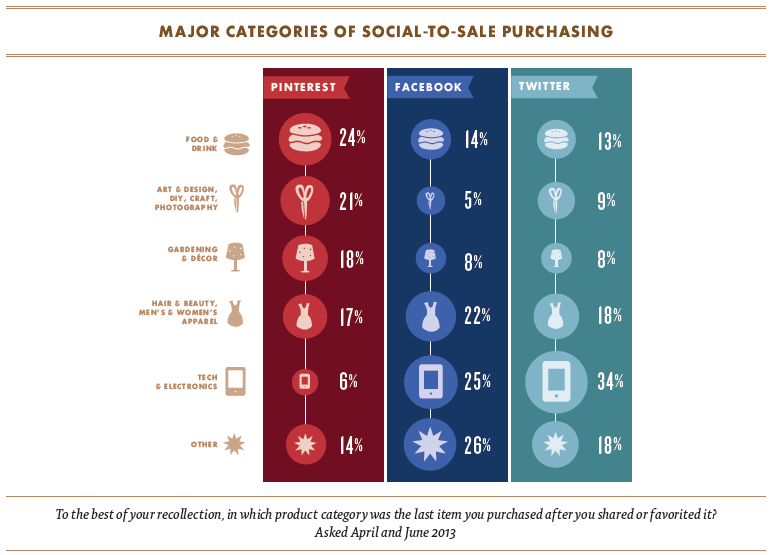 - 47% ของผู้ซื้อที่มาจาก Pinterest บอกว่าการซื้อเกิดจากการเห็นโดยบังเอิญ จากนั้นจึงทำการบันทึกไว้หรือแชร์ต่อก่อนที่จะซื้อ แต่ไม่ได้เริ่มจากการค้นหาโดยตั้งใจ ซึ่งกลุ่มสินค้าที่ซื้อมากที่สุดคือ อาหารและเครื่องดื่ม