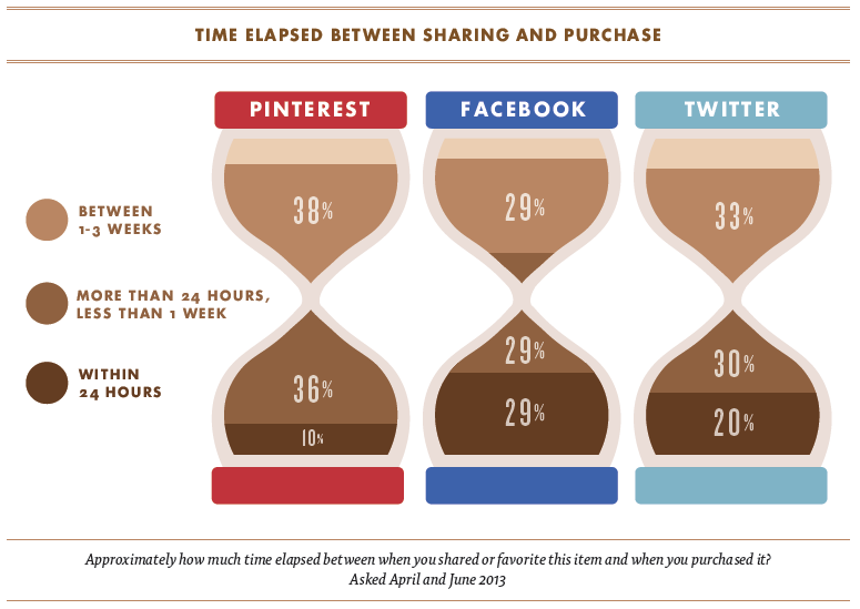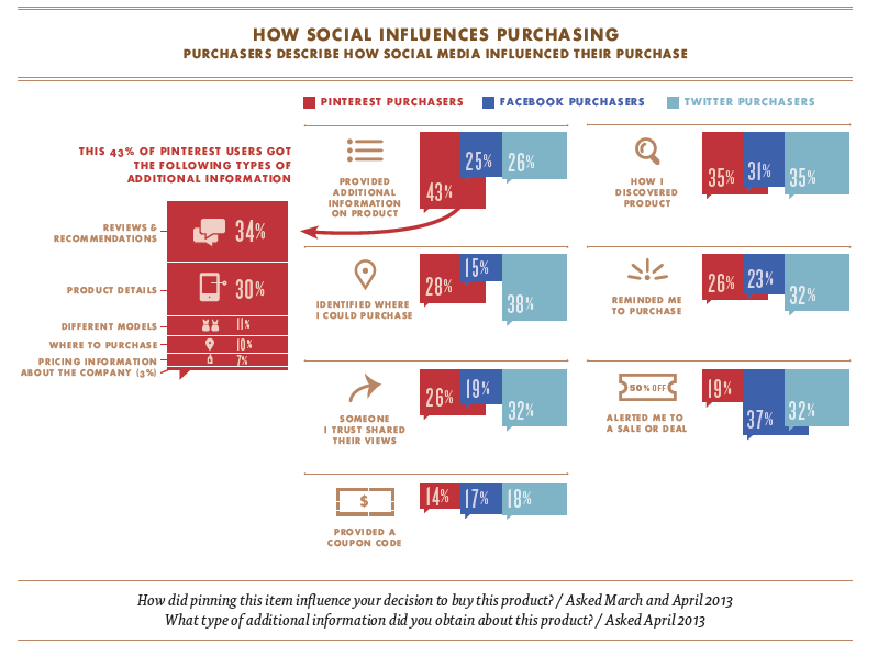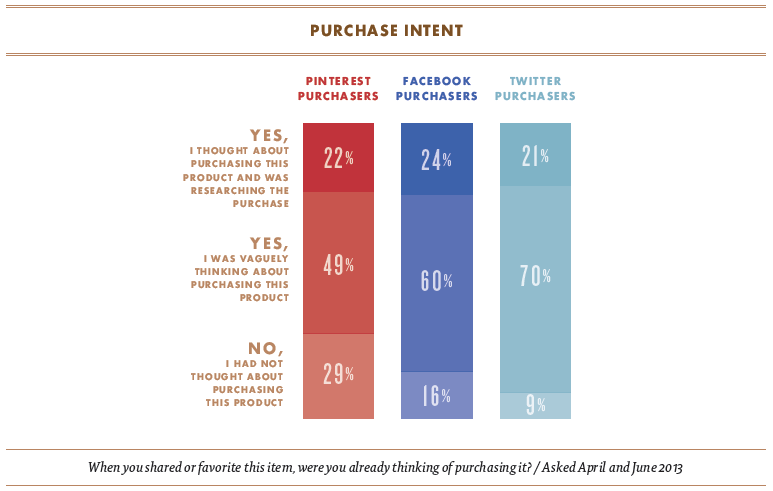 จากผลสำรวจที่ได้จะเห็นว่าจริงๆ แล้วส่วนใหญ่ลูกค้ามีความคิดที่จะซื้อสินค้าอยู่ก่อนแล้ว สำหรับลูกค้าที่ใช้ Pinterest นั้น 50% ของผู้ตอบคำถามถึงกับมีการสร้าง Pin board ไว้สำหรับเก็บรายการสินค้าที่ตั้งใจจะซื้อ (Pin board มีลักษณะคล้ายๆ อัลบั้มที่ใช้เก็บรูปอย่างเป็นหมวดหมู่)