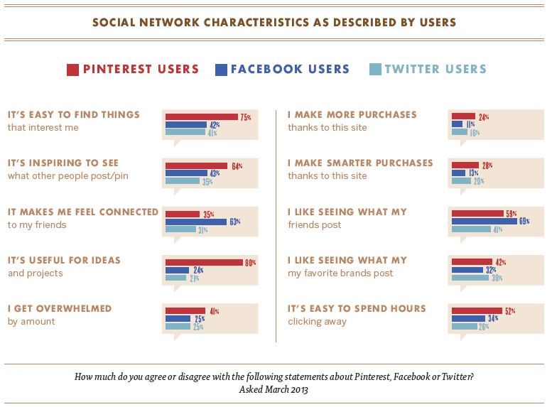 การค้นเจอว่าลูกค้าชอบหรือไม่ชอบอะไรในแต่ละช่องทางที่บริษัทใช้ จะช่วยให้เราสามารถวางแผนการผลักดันได้อย่างตรงจุด เช่น จากรูปด้านบน Pinterest เหมาะกับการเป็นแหล่งค้นหาไอเดียใหม่ๆ ในขณะที่ Facebook จะเน้นไปที่การดูว่าเพื่อนโพสต์อะไรไว้บ้าง ส่วน Twitter ถือว่าทำได้ค่อนข้างดีในแน่ของการสื่อสารจากแบรนด์โดยตรง