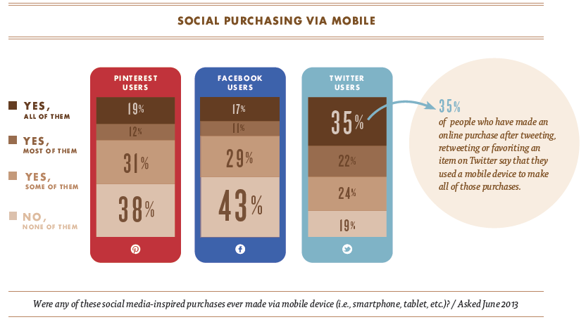 จากสถิติจะเห็นว่ามีนักซื้อที่ได้รับแรงบันดาลใจผ่าน Facebook ถึง 43% ที่ไม่ได้ซื้อสินค้าผ่านโทรศัพท์มือถือ แต่ถึงกระนั้น การใช้โทรศัพท์มือถือก็เข้ามามีบทบาทกับการซื้อสินค้ามากขึ้นเรื่อยๆ โดยเฉพาะกับกลุ่มผู้ใช้ Twitter