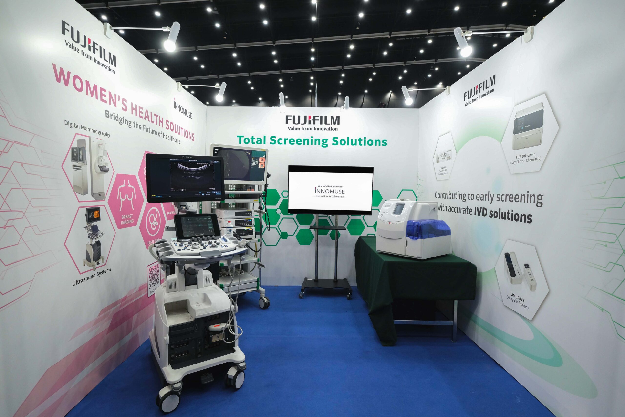 โซลูชันการคัดกรองครบวงจรด้านสุขภาพสตรีของฟูจิฟิล์มอยู่ภายใต้คอนเซ็ปต์ INNOMUSE ซึ่งเป็นการผสมคำว่า “Innovation” กับ “Muse” โดย INNOMUSE ได้ผสานรวมเทคโนโลยีขั้นสูงที่ออกแบบมาเพื่อการตรวจคัดกรองและการดูแลสุขภาพสตรี การตรวจเต้านมด้วยเครื่องเอกซเรย์ระบบดิจิทัล (Mammography) สูติศาสตร์ นรีเวชวิทยา และสุขภาพกระดูก รวมไปถึง AMULET Innovality เครื่องเอกซเรย์เต้านมระบบดิจิทัล และ Arietta 850 DeepInsight เครื่องอัลตราซาวด์ที่นำมาจัดแสดงในงานนี้