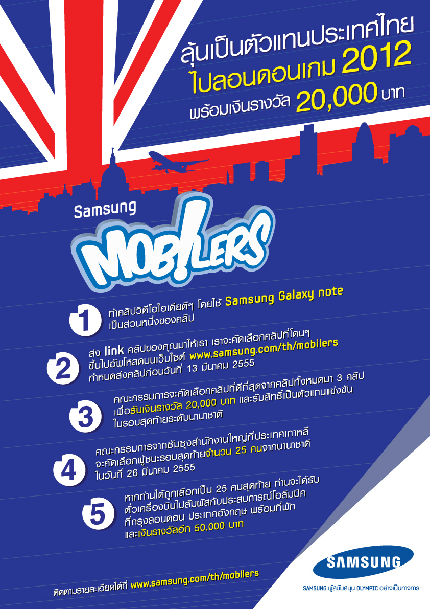 มีข่าวฝากประชาสัมพันธ์จากบริษัทไทย ซัมซุง อิเล็คทรอนิกส์ มาครับ ถ้าหากว่าคุณเป็นคนออนไลน์คนหนึ่งที่ชอบสร้างคลิปวิดีโอ มั่นใจตัวเองมีไอเดียสดใหม่ น่าจะสนใจครับ ข่าวเขาบอกว่า?ลุ้นเป็นตัวแทน Samsung จากประเทศไทยไปสัมผัสประสบการณ์โอลิมปิคที่กรุงลอนดอน?พร้อมเงินรางวัล 20,000 บาท เพียงแค่ส่งคลิปสนุกๆ ที่มี Galaxy Note เป็นส่วนประกอบหลัก พร้อมใส่ไอเดียสร้างสรรค์ลงไปในคลิป ก็มีสิทธิ์ลุ้นเป็น 3 ตัวแทนจากประเทศไทยไปแข่งขันระดับนานาชาติ และหากคลิปของคุณผ่านเข้ารอบเป็น 25 คลิปสุดท้ายจากทั่วโลกก็เตรียมตัวบินไปสัมผัสโอลิมปิคที่กรุงลอนดอนประเทศอังกฤษได้แบบฟรีๆ?สนใจรายละเอียดคลิกได้ที่นี่เลยครับ?http://www.samsung.com/th/mobilers/