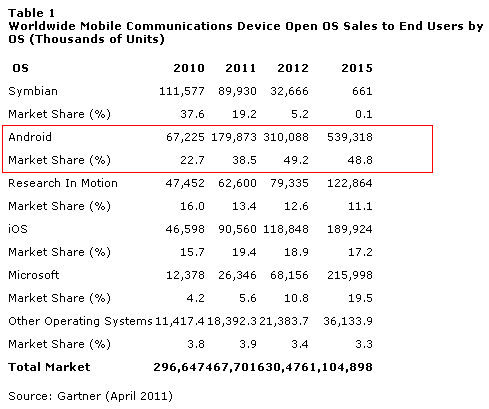 Gartner ได้ออกมาคาดการณ์ในสิ้นปี 2012 android จะมีส่วนแบ่งในตลาดสมาร์ทโฟนเกือบครึ่งเลยทีเดียว (ใกล้เคียงกับข้อมูลจาก ABI Research เช่นกัน) ซึ่งแน่นอนว่ามีผลมาจากราคาที่ถูกลงจนใครหลายๆ คนก็สามารถหาซื้อได้แม้กระทั่งผู้ใช้เองบางทีก็ไม่รู้ตัวว่ากำลังใช้ android OS อยู่