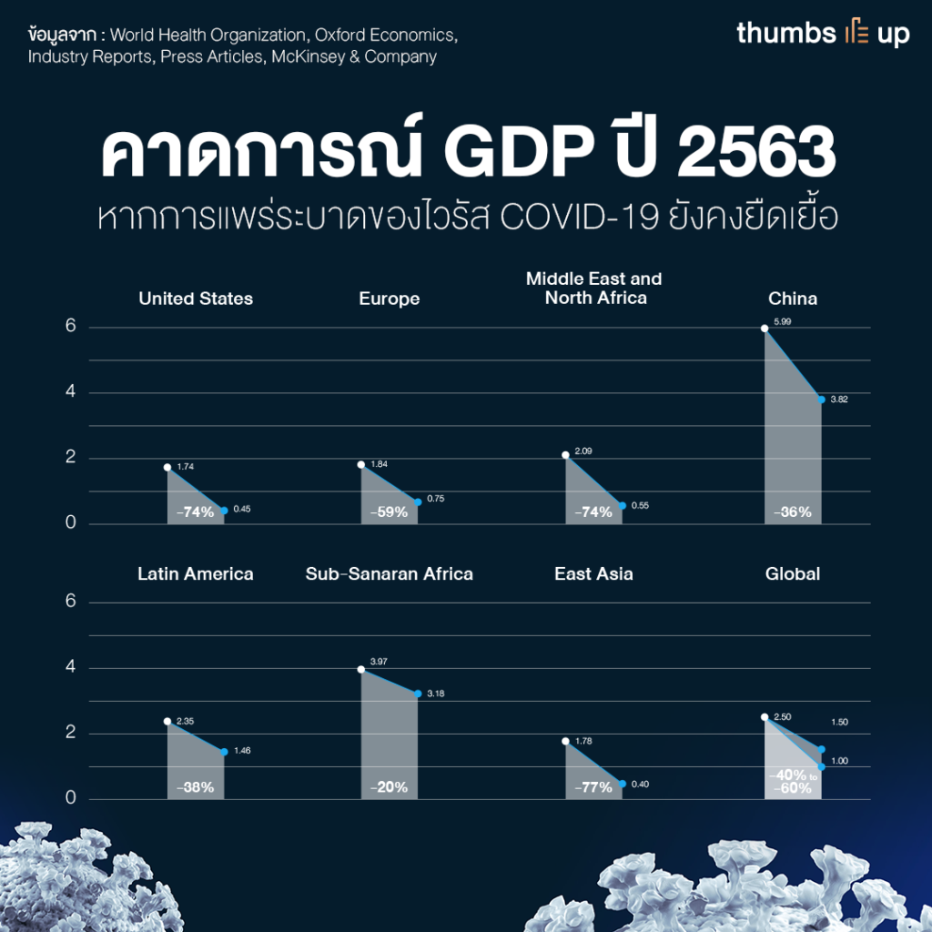 หากสถานการณ์การระบาดของไวรัส COVID-19 ยังคงยืดเยื้อการเติบโตของเศรษฐกิจโลกจะลดลงจาก 2.5% เหลือ 1 – 1.5% โดยในไตรมาสที่ 1 ตลาดหุ้นทั่วโลกร่วงระนาว ความต้องการของผู้บริโภคฟื้นตัวช้าและเกิดการชะงักตัวของห่วงโซ่อุปทาน