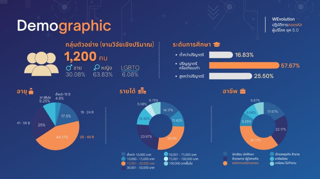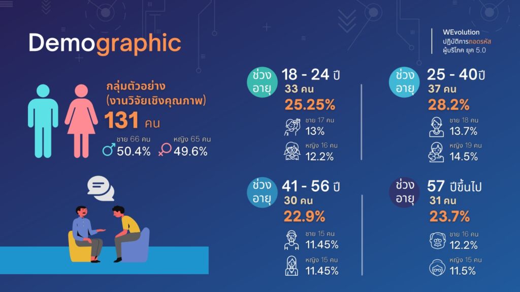 ด้าน นายวีระศักดิ์ สวัสดิ์จันทร์ หัวหน้าทีมการนำเสนองานวิจัย WEvolution ปฏิบัติการถอดรหัสผู้บริโภคยุค 5.0 และนักศึกษาปริญญาโท วิทยาลัยการจัดการ มหาวิทยาลัยมหิดล (CMMU) กล่าวว่า จากการถอดรหัสหลักคิดเชิงลึกของผู้บริโภค ผลวิจัย 3 คลัสเตอร์ใหม่ (Cluster) ที่สะท้อนตัวตนของผู้บริโภคไทยยุค Gen We ในช่วงอายุดังกล่าว ประกอบด้วย