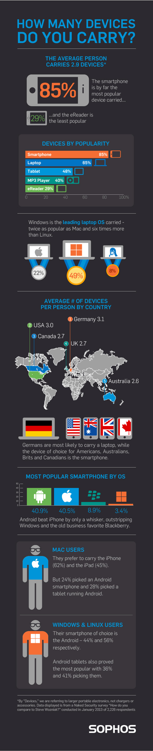Sophos ได้สำรวจข้อมูลจากกลุ่มตัวอย่างกว่า 2,000 คน พบว่าในแต่ละวันคนส่วนใหญ่พกพาอุปกรณ์เคลื่อนที่ในชีวิตประจำวันเฉลี่ยอยู่ที่คนละ 2-3 เครื่อง โดยโทรศัพท์สมาร์ทโฟนจัดได้ว่าเป็นอุปกรณ์เคลื่อนที่ที่ได้รับความนิยมสูงสุด (85%) รองลงมาเป็นแล็ปท็อป (65%) แท็บเล็ต (48%) รวมไปถึงเครื่องเล่น MP3 (40%) และ E-Reader (29%)