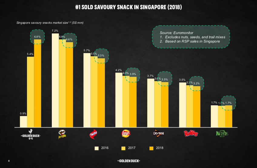 The Golden Duck หนังปลาทอดรสไข่เค็มสัญชาติสิงคโปร์ ที่กลายเป็นรสชาติที่คนไทยไปเที่ยวสิงคโปร์ต้องหยิบกลับมาเป็นของฝาก เช่นเดียวกับแบรนด์คู่แข่งอย่าง IRVINS ที่เรียกว่าในช่วงกลางปีที่แล้วนั้น สองแบรนด์นี้บี้ส่วนแบ่งตลาดกันอย่างมาก ยิ่งกระแสโซเชียลมีเดียที่ร้อนแรง ทำให้ IRVINS ตัดสินใจเข้ามาเป็นผู้เล่นในไทยก่อน เห็นได้จาก Pop up Store ในห้างสรรพสินค้าชั้นนำ