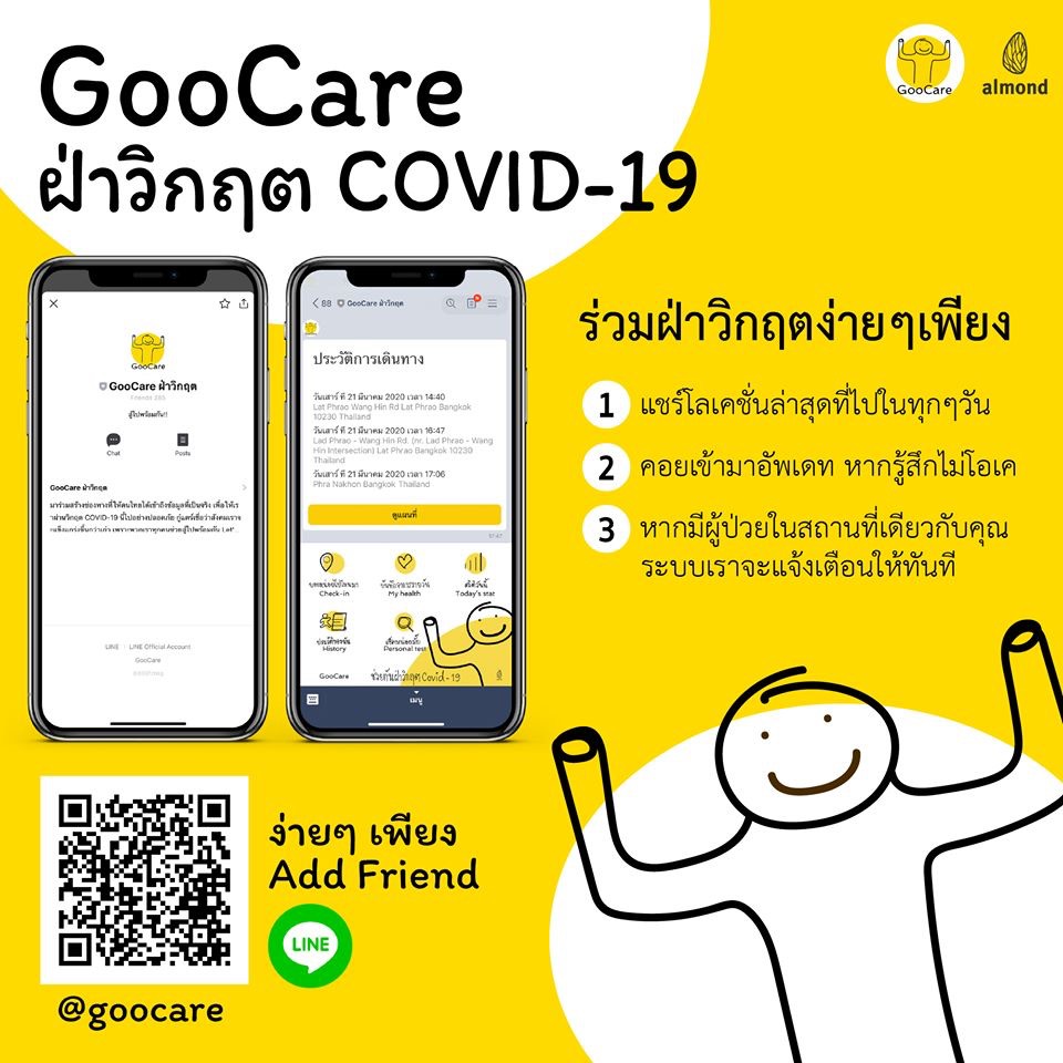 Almond Digital Group บริษัทที่ปรึกษาด้านการพัฒนานวัตกรรมเพื่อเพิ่มมูลค่าธุรกิจด้วยการสร้างประสบการณ์ใหม่ให้กับตลาดและผู้บริโภค พัฒนาแพลตฟอร์มใหม่ล่าสุดใน LINE OA ชื่อ “GooCare” หรือ “กู๋แคร์” ช่วยแก้ปัญหาโควิด-19 ให้ผู้ใช้จดจำสถานที่ เช็กสถานการณ์ บันทึกอาการรายวันและทดสอบความเสี่ยง ลดปัญหาความไม่มั่นใจกับอาการป่วย