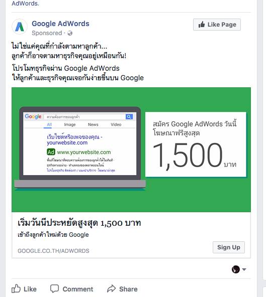 การลงมาซื้อโฆษณากับ Facebook นี้เชื่อมกับเพจ Google AdWords ที่เปืดอย่างเป็นทางการด้วยภาษาไทยบน Facebook ตั้งแต่ 31 สิงหาคม 2015 ตลอด 2 ปี เพจมีการให้ข้อมูลบริการ Google AdWords อย่างต่อเนื่อง ถูกคนไทยแชร์ส่งต่อหลายครั้งนับไม่ถ้วน