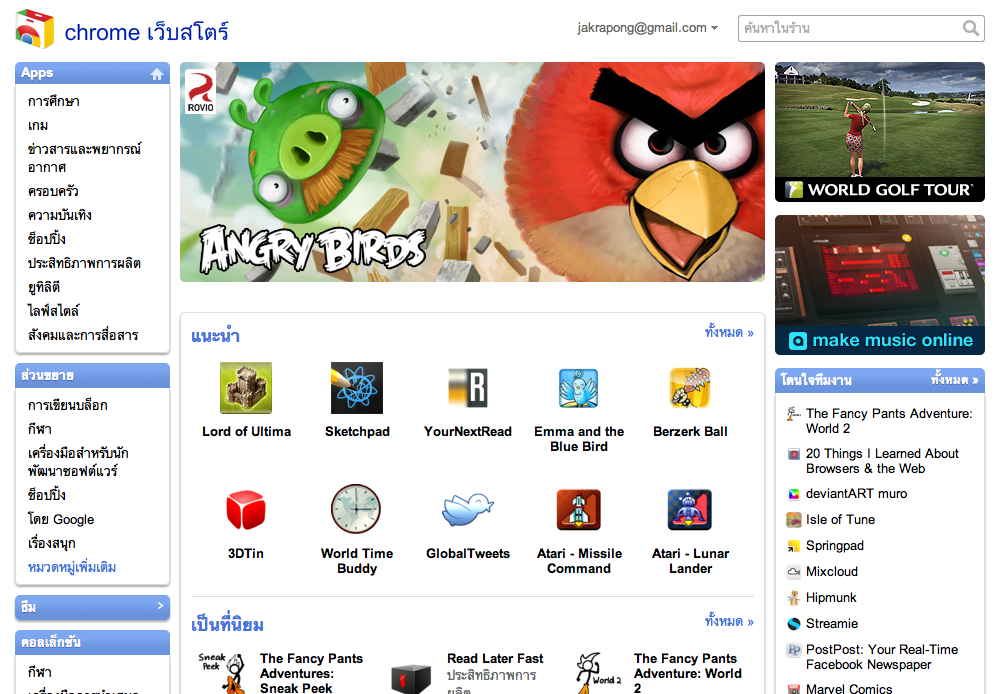 2. ประกาศการรับรองภาษาไทยของ Chrome Web Store ร้านขายเว็บแอพพลิเคชั่น ซึ่งทาง Google เพิ่งเพิ่มภาษาที่รองรับเป็น 41 ภาษา ที่ Blognone รายงานไม่นานมานี้ว่า ขณะนี้ได้รวมภาษาไทยไว้ด้วยแล้ว ส่วนคนที่สนใจสามารถทดสอบได้เลย โดยเข้าไปที่ Chrome Web Store แล้วเลือกภาษาไทย ก็จะได้ตามภาพด้านล่าง แถมถ้าดูให้ดีจะมีแอพพลิเคชั่นที่น่าใช้หลายๆ อัน ที่ผมว่ามีประโยชน์คือ แอพฯ ที่ทำให้นักเรียนเรียนเก่งขึ้น มี Angry Birds ให้เล่นด้วย ส่วนของไทยจะเป็นพวกปลั๊กอินที่เคยเปิดตัวไปตั้งแต่ปีที่แล้ว เช่น? MGRFont สำหรับปรับขนาดฟอนต์ในเว็บไซต์ผู้จัดการ, TARAD, EDTGuide, และ Sanook! อยู่ในนั้นด้วย