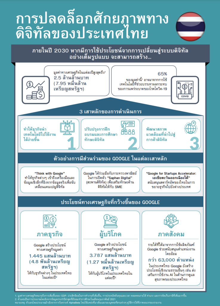 Google เผยแพร่รายงานที่มีชื่อว่า “Unlocking Thailand’s Digital Potential” (การปลดล็อกศักยภาพทางดิจิทัลของประเทศไทย) ที่จัดทำโดย AlphaBeta โดยรายงานฉบับนี้ระบุว่าการเปลี่ยนรูปแบบสู่ระบบดิจิทัลจะสามารถสร้างมูลค่าทางเศรษฐกิจให้กับประเทศไทยได้ถึง 2.5 ล้านล้านบาทต่อปี (7.95 หมื่นล้านเหรียญสหรัฐ) ภายในปี 2573 หรือหากเทียบให้เห็นภาพชัดเจน มูลค่านี้จะเทียบเท่ากับประมาณ 16% ของ GDP ประเทศไทยในปี 2563