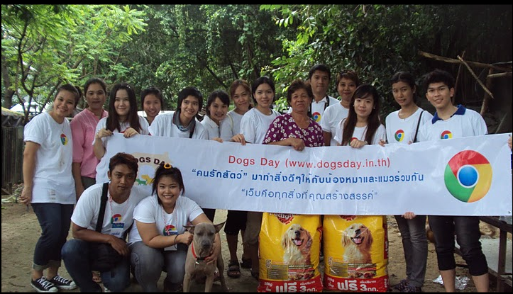 มูลนิธิคนรักสัตว์กว่า 10 องค์กรร่วมกับ Google ประเทศไทย ระดมพลคนออนไลน์ใจดีพร้อมอาสาสมัครกว่า 200 คน เพื่อช่วยเหลือสุนัขและแมวจรจัดที่ถูกทอดทิ้ง ในเขตกรุงเทพและจังหวัดใกล้เคียง จำนวนกว่า 5,000 ตัว ในกิจกรรม ?Dogs Day? เมื่อวันที่ 15 ก.ค. ที่ผ่านมา แสดงพลังสร้างสรรค์สังคมด้วยคุณค่าจากเว็บ