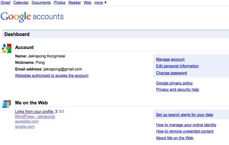 Google ได้แนะนำเครื่องมือที่ช่วยให้คุณจัดการผลการค้นหาที่เกี่ยวข้องกับชื่อของคุณ ที่เรียกว่า ?Me on the Web,? ซึ่งจะเป็นส่วนหนึ่งที่อยู่ใน? Google dashboard ของคุณด้านล่างตรงระหว่าง account information กับส่วน analytics
