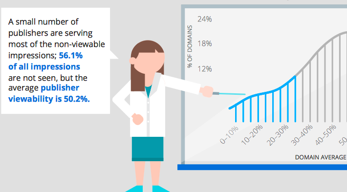 ผลสำรวจของ Google ในภาพรวมตลาดโฆษณาออนไลน์ถูกร้อยเรียงลงในอินโฟกราฟฟิกชื่อ “Five Factors of Viewability” ซึ่ง Google เผยแพร่เมื่อสัปดาห์ที่ผ่านมา ในแผนภาพแสดงความจริงที่ว่า โฆษณาประเภท display ads จำนวนมากนั้นถูกลงประกาศโดยไม่ได้คำนึงถึงโอกาสที่จะถูกชาวออนไลน์มองหรืออ่าน จุดนี้ Google ยอมรับว่าโฆษณามากกว่า 56.1% ทั้งจากเครือข่ายอื่นและบนแพลตฟอร์ม Google และ DoubleClick ล้วนพบวิกฤตินี้