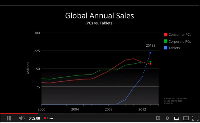 Sundar เล่าว่า Google ได้ลงทุนอย่างมากในการพัฒนา Android และ Chrome ในฐานะที่เป็นระบบปฏิบัติการอันดับ 1 และเบราเซอร์อันดับ 1 ของโลก จากนั้นก็เปิดเผยสถิติการใช้งานของทั้งตลาด PC และการใช้งาน Android เพื่อปูทางเข้าสู่การใช้งานแทปเบล็ตซึ่งถือเป็นการเติบโตที่สูงมาก และเล่าถึงความสำเร็จของแทปเบล็ต แอพฯ บน Google Play และความร่วมมือกับผู้ผลิตอุปกรณ์ชั้นนำทั้งหลาย