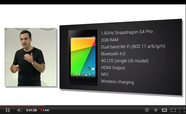 Sundar ปูทางให้ผู้บริหารคนต่อไปขึ้นมาเล่าต่อเกี่ยวกับแทปเบล็ตซึ่งเจาะไปที่ Nexus 7 ที่ให้ Asus เป็นผู้ผลิตอีกครั้ง โดยเน้นจุดขายที่ Portability, Performance และ Google Power ซึ่ง Nexus 7 บางลง ถือง่ายขึ้น และใช้วัสดุที่รู้สึกดีขึ้นเวลาถือในมือ